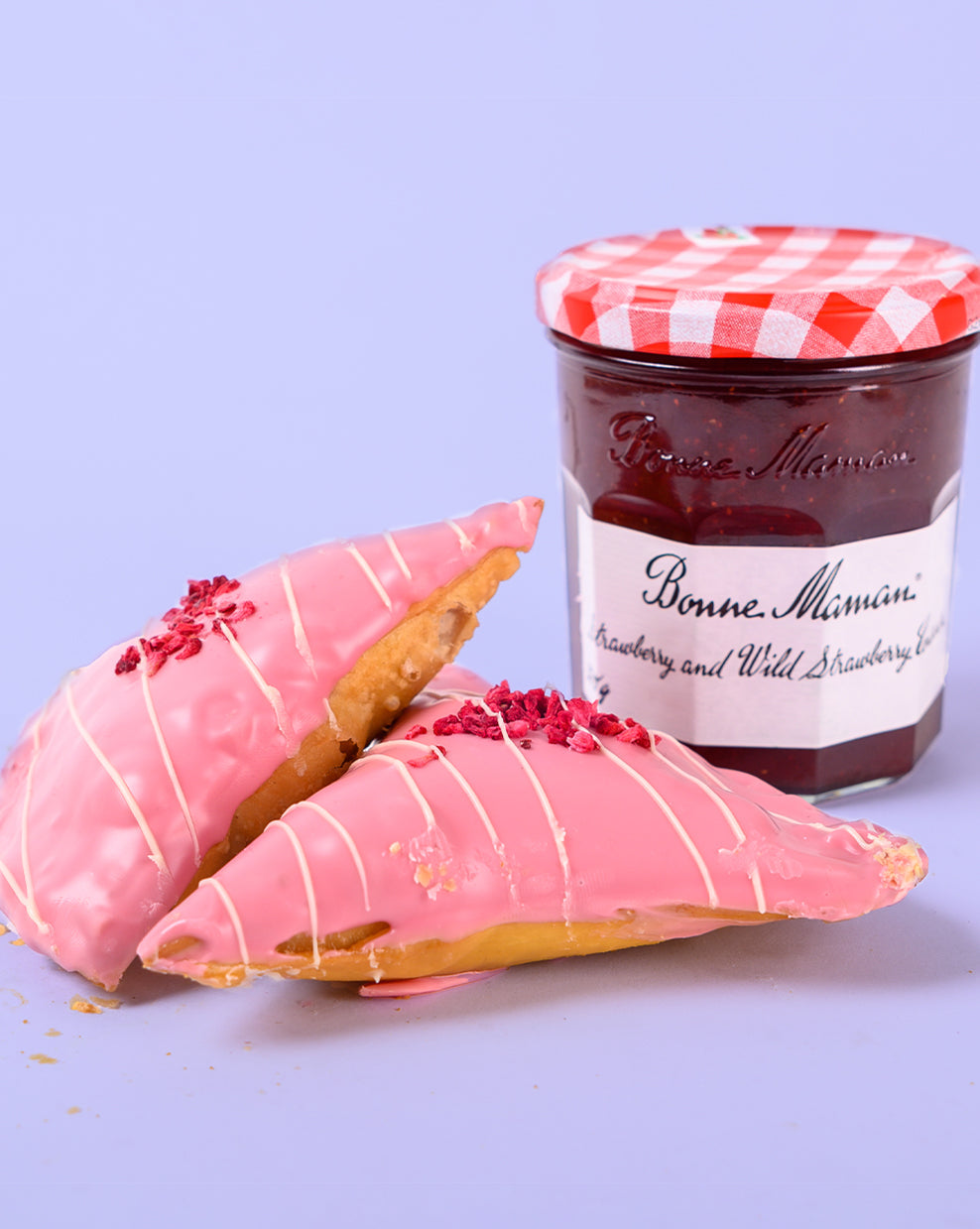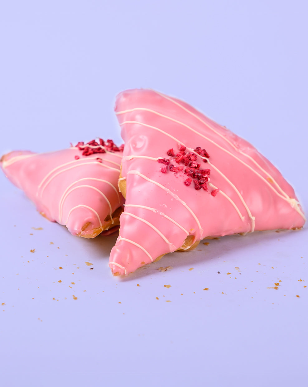 Filled with a strawberry and cream filling with chopped shortcake pieces, glazed with a strawberry chocolate, piped with white chocolate and topped with freeze dried fruit pieces.