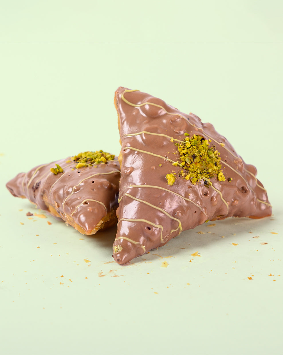 Filled with pistachio ganache and roasted kunafa pastry, glazed with milk chocolate, piped with pistachio chocolate and topped with pistachio crumbs.